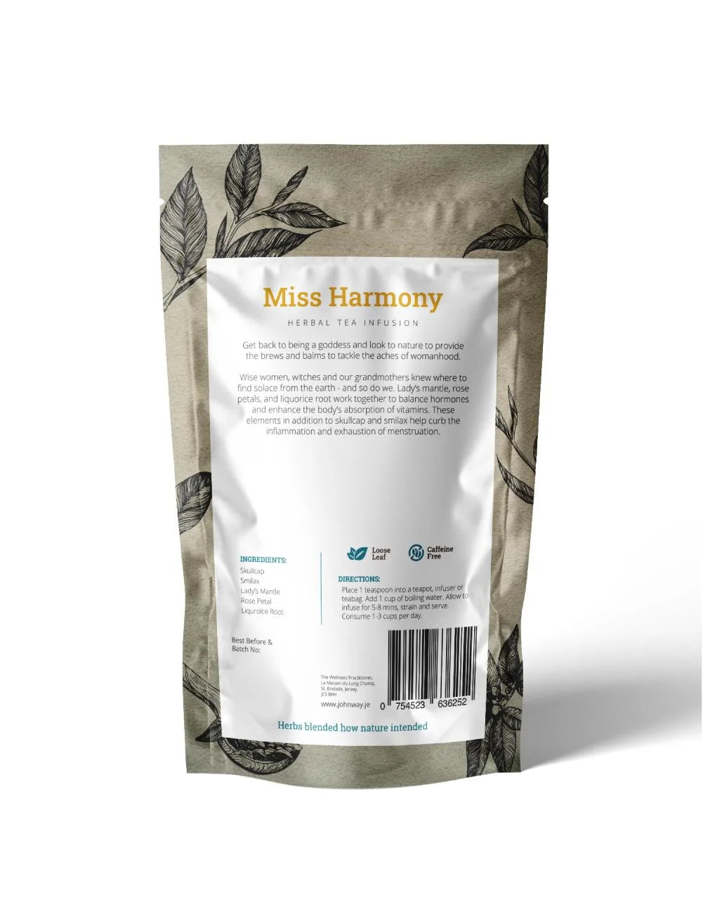 Miss Harmony Herbal Tea Infusion is a handcrafted blend of herbs that are sourced in the UK, specifically chosen to help support women's reproductive health. This herbal tea infusion is sold in loose leaf form and contains a mix of Lady's mantle, Rose petals, Liquorice, Skullcap and Smilax herbs.