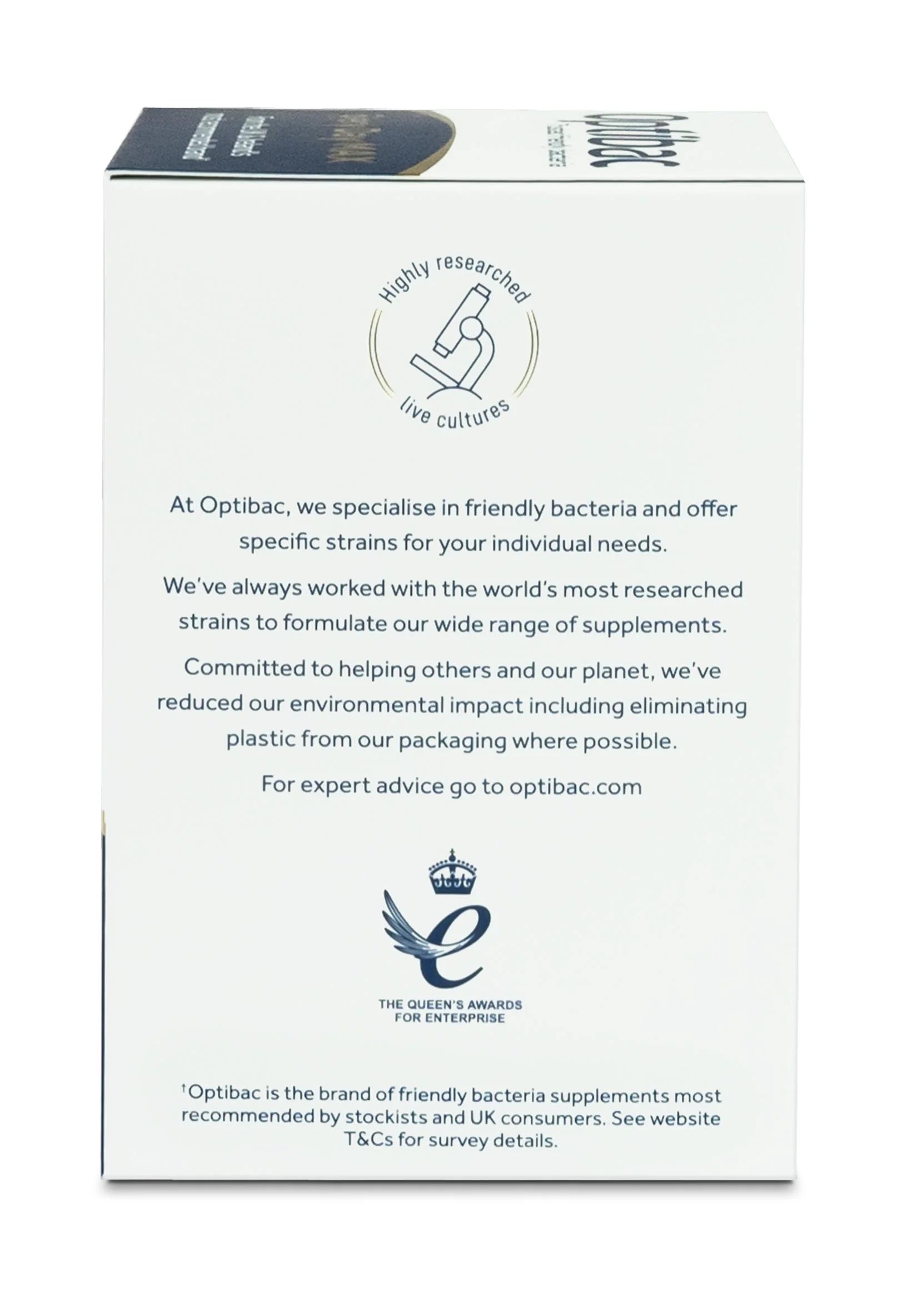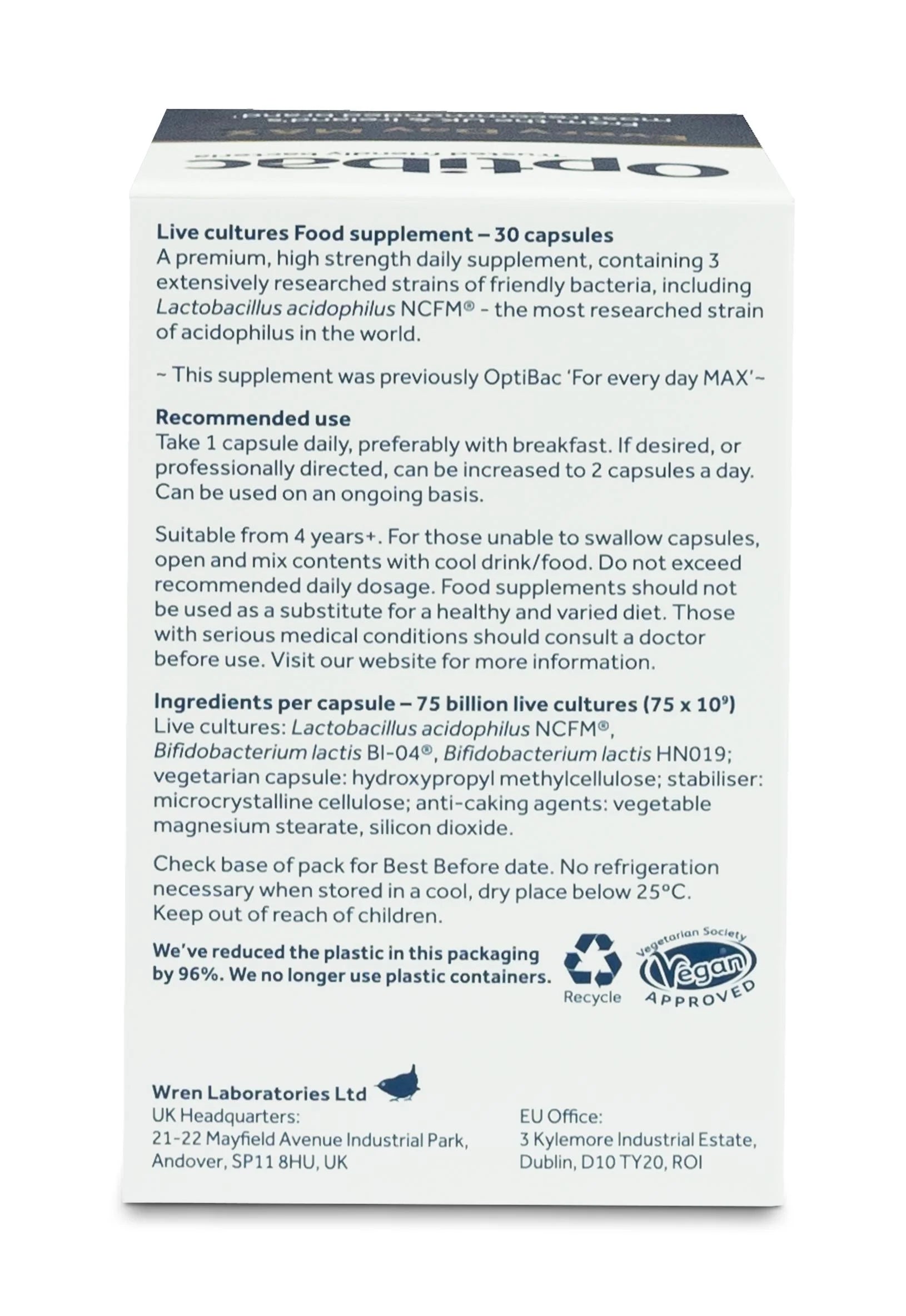 Do not exceed recommended daily dosage. This is a food supplement and is not intended to diagnose, treat, cure or prevent any disease. Food supplements should not be used as a substitute for a healthy lifestyle and varied diet. Live cultures are not recommended for those with serious medical conditions. If you are taking any medications or have a serious medical condition, consult a doctor before use. Keep out of reach of children. Optibac supplements will not cause dependency and may be used on